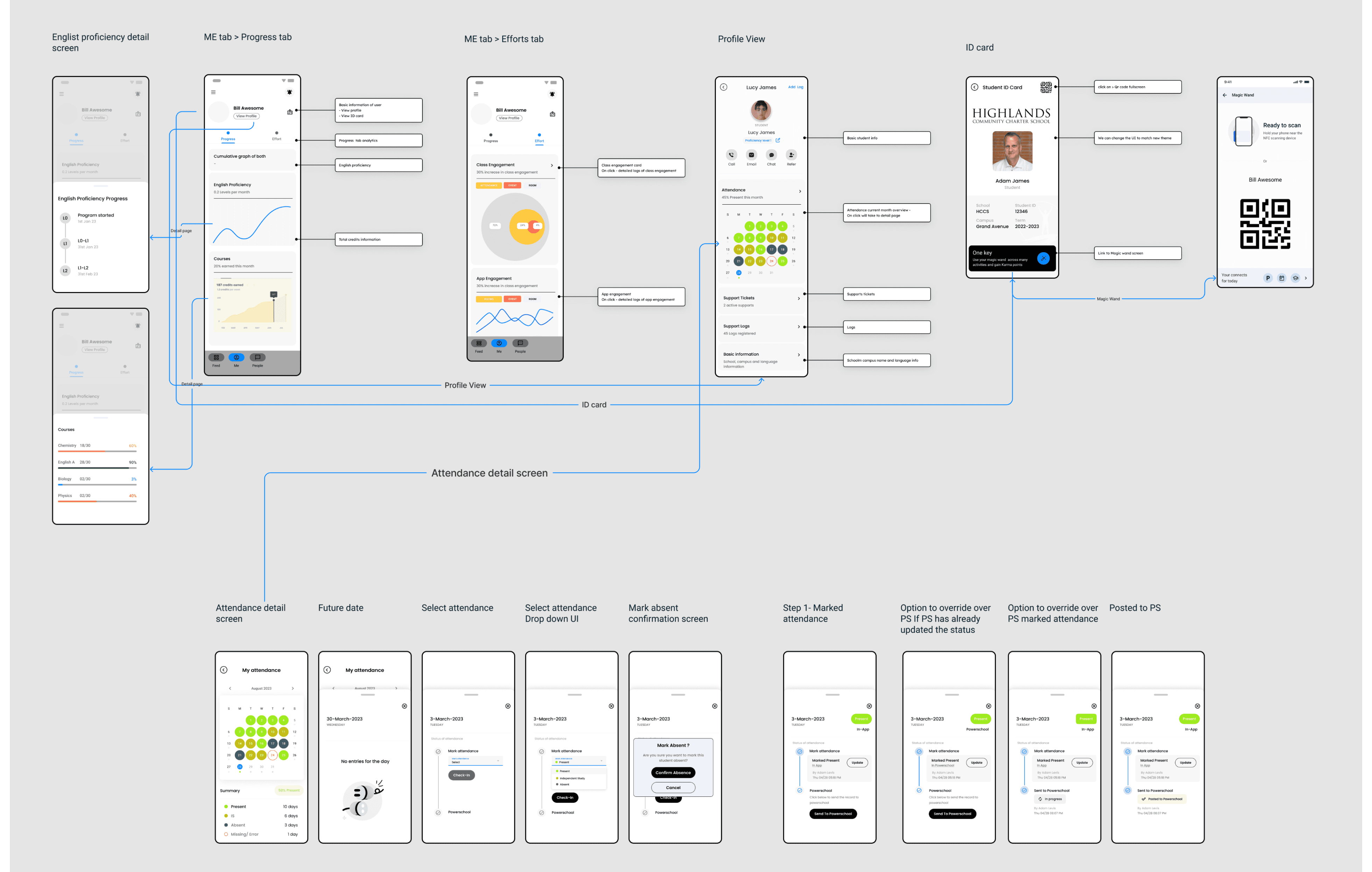 Below is one in a series of wireframes we submitted to the client, illustrating a complex method for marking attendance for a student. Idea is to cover all the base user stories before starting with final UI.