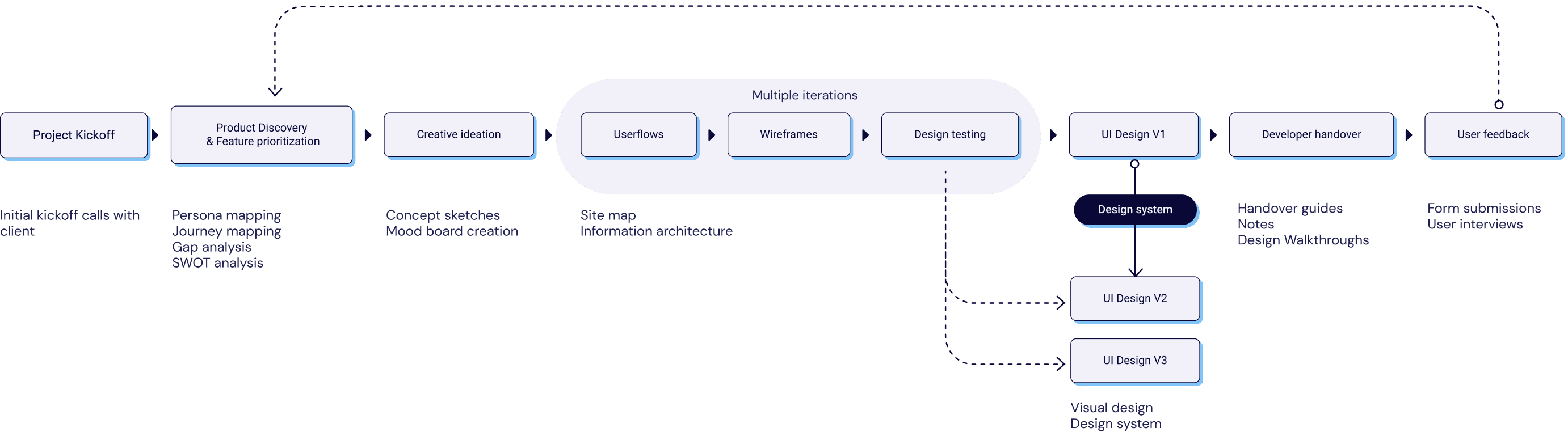 One of the many approaches we employ is to pitch initial-level ideas with the client, facilitating a brainstorming session to explore various options. Following this collaborative process, we finalize the chosen concept before progressing to the next step, creating wireframes that delve into the details of functionality and user stories.